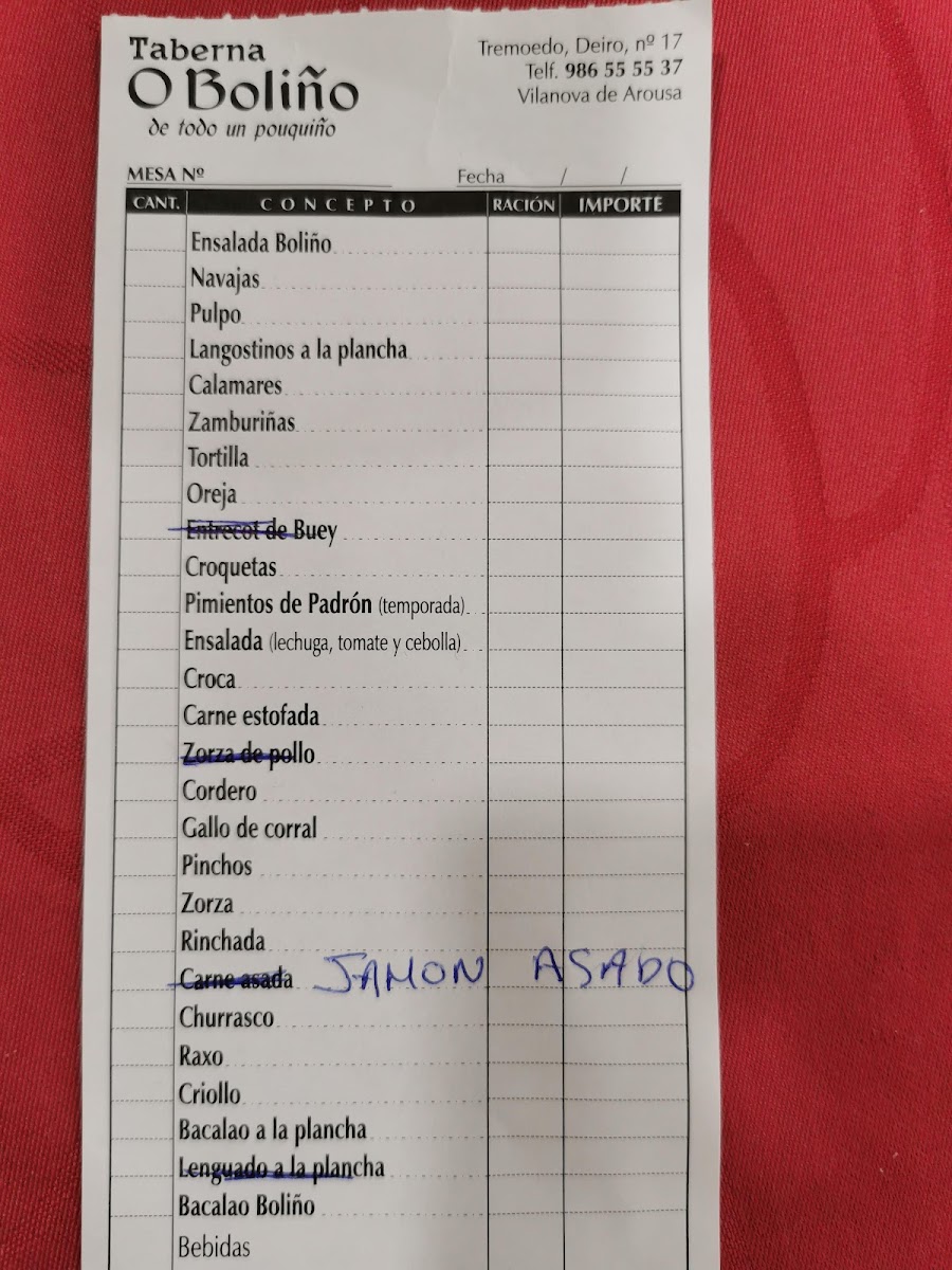 The menu at taberna boliño presents a variety of traditional Spanish dishes with a focus on Galician cuisine. It is structured to offer a range of options including seafood, meat dishes, and desserts, suitable for lunch or dinner.